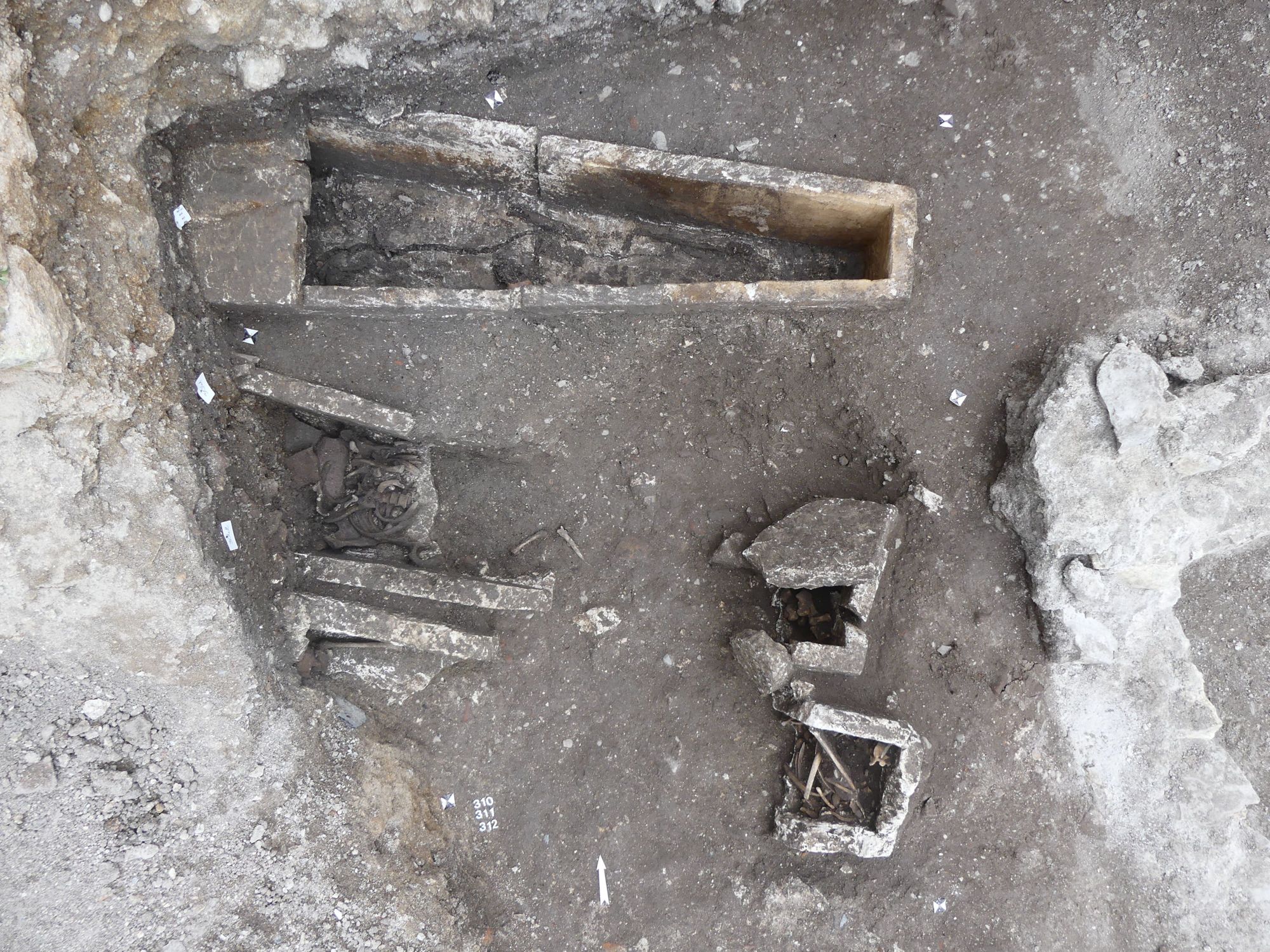 Sarcophages du Haut Moyen Âge placés à proximité de l'emplacement de la tombe de l'évêque Euverte (fouille du Lycée Saint-Euverte ; service d'archéologie, 2017).