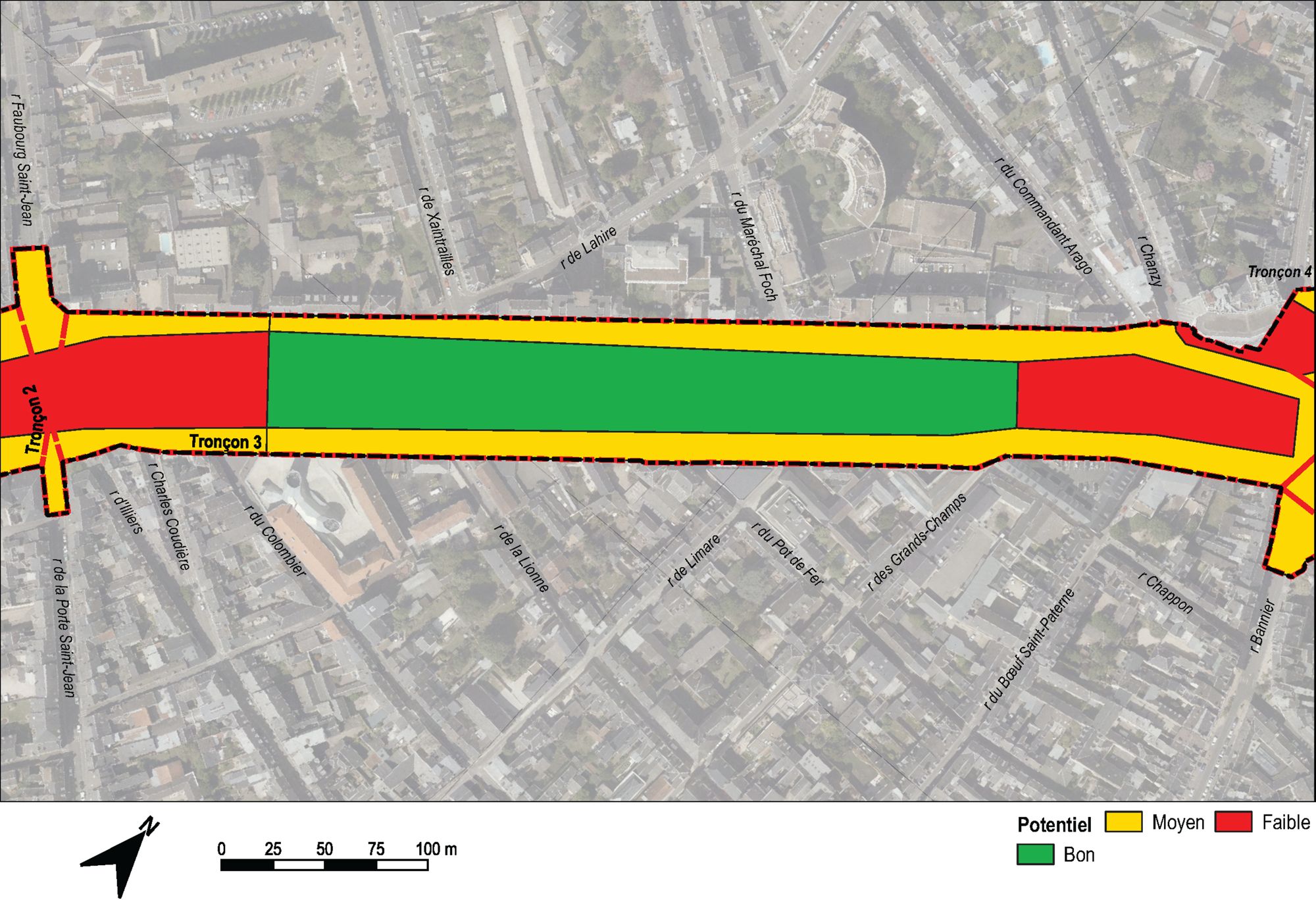 Potentiel archéologique Le potentiel archéologique d'un secteur est une estimation de la nature et de la conservation des vestiges matériels en sous-sol. Potentiel archéologique du boulevard Rocheplatte déterminé en synthèse de l'étude documentaire et historique (Service d'archéologie, 2023).).