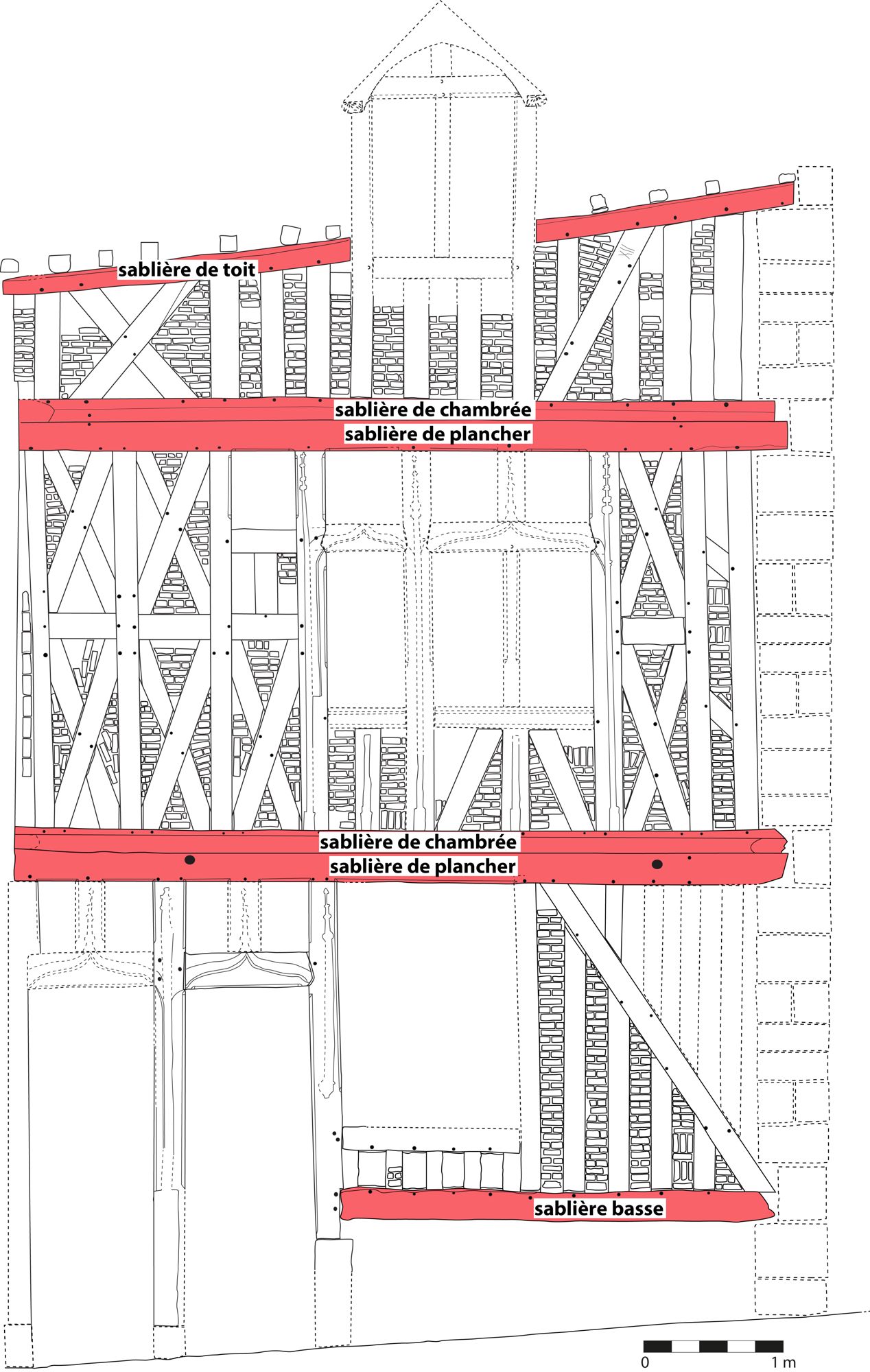 - de chambrée : sablière qui repose dans la chambrée des supports de plancher. La sablière de chambrée n’apparaît que dans certains pans de bois où elle double la sablière de plancher. Elle est parfois qualifiée de sablière basse car elle située à la base d’un niveau logeable.